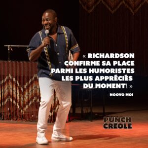 Punch créole, le 2e one-man-show de l’humoriste Richardson Zéphir, n’est pas qu’un simple spectacle : c’est une célébration où la rigolade, la musique et l’improvisation se rencontrent dans une ambiance aussi chaleureuse que festive. Avec son charisme naturel et sa personnalité attachante, Richardson se déploie sur scène avec ses mimiques, son jeu physique éclatant et ses changements de voix qui donnent à ses anecdotes savoureuses une couleur unique et hilarante. Ce spectacle vivant et authentique, à l’image de Richardson, charmera autant les amateurs de stand-up que les fans d’improvisation et les téléspectateurs qui l’ont adoré dans LOL : Qui rira le dernier? ou Big Brother Célébrités. Laissez-vous emporter par l’énergie débordante de Richardson Zéphir et ses blagues livrées comme un bon punch créole, qui vous laisse le sourire aux lèvres et le coeur léger.